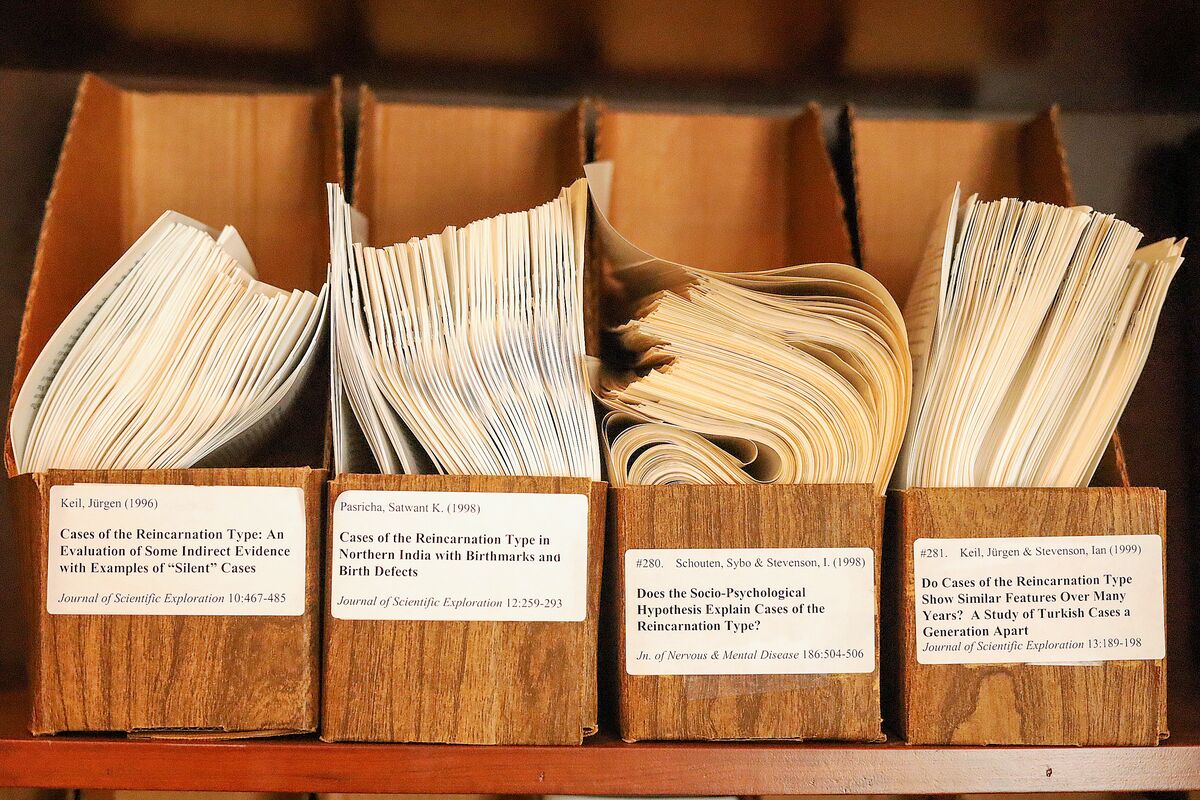 Selected published manuscripts displayed in the Ian Stevenson Memorial Library at the Division of Perceptual Studies (DOPS), University of Virginia, Charlottesville, VA. Photo: Kathryn Holstrom